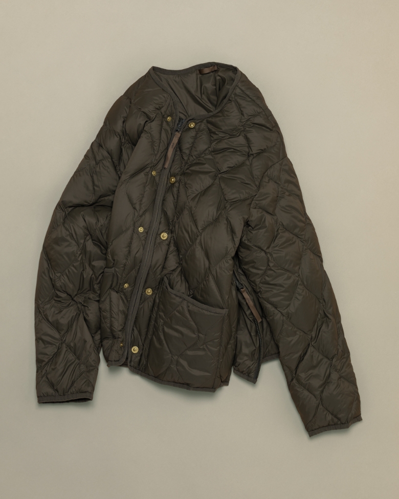 〈TAION〉の名作ダウンをベースに別注した多機能な一着。保温性に優れた800フィルパワーのダウンを採用した「M-65ライナー」タイプは、両脇のスリットで可動域を広げつつ、前立てのボタンを留めればすっきりとした細身のシルエットに変化。これを、ヘチマキルトのダウンステッチ面とミニマルなノーステッチ面——表情の異なる二つの顔を持つリバーシブル仕様に。軽く柔らかな生地選びから、パイピングやボタン、ポケットの仕様に至るまで、こだわり抜いた別注ディテールが冴える。