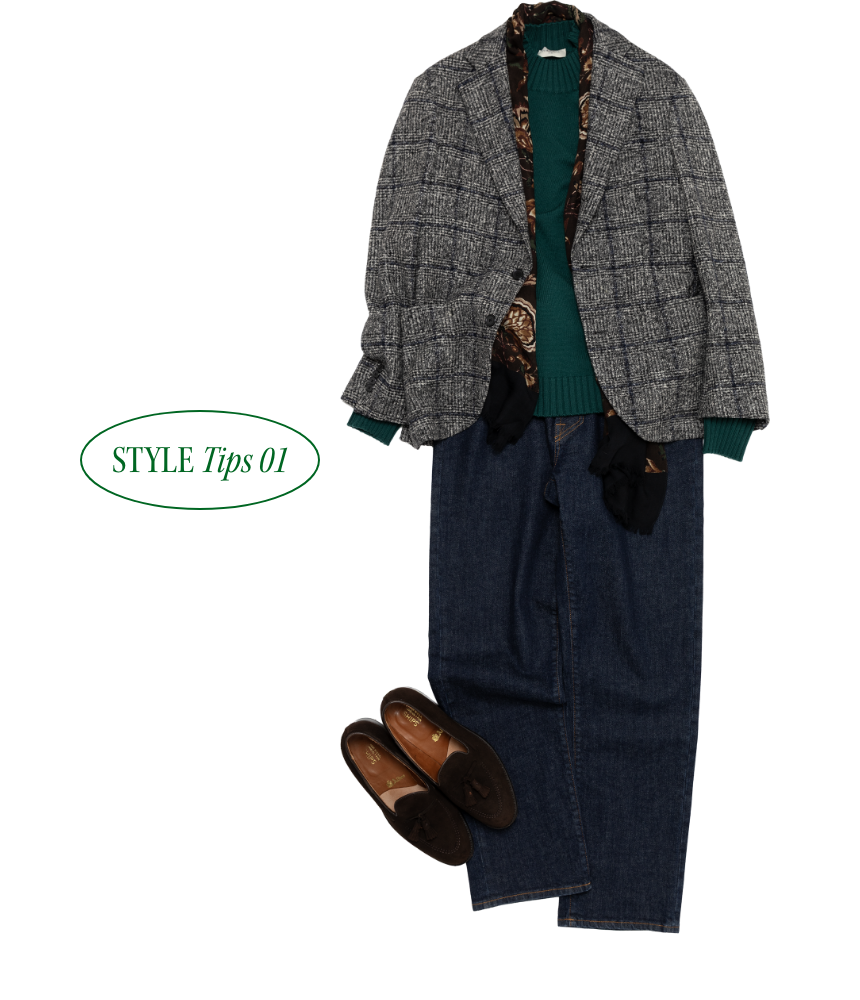 大人の洒落感を狙うなら、インポート素材のジャケットスタイルがちょうどいい。軽さと柔らかさを備えたジャージー素材で快適さを保ちつつ、カラーニットとデニムで抜けをつくる。ストールとレザーシューズで全体を整えて、上品さとリラックスが自然に溶け合うスタイルに。仕上げには、ウールコートをさらりと羽織りたい。