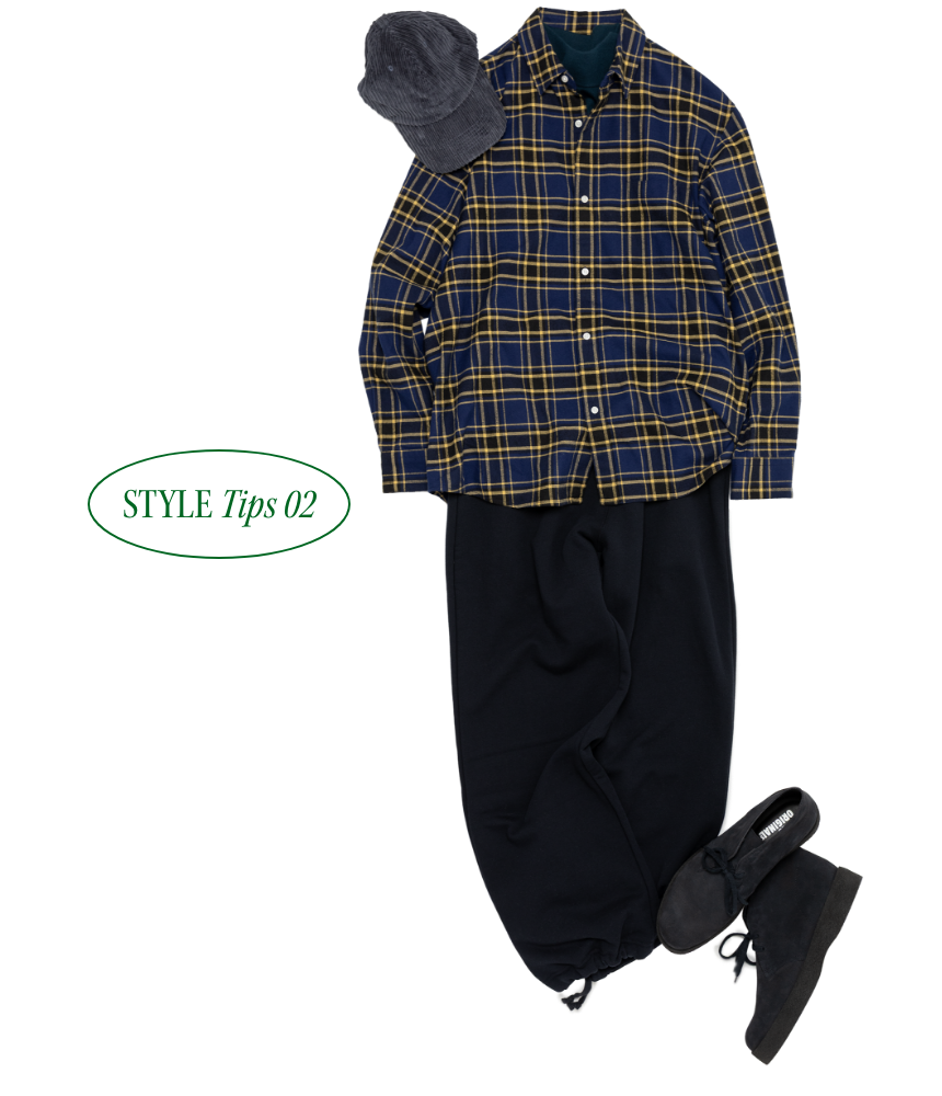 主なアイテムのルーツはいずれも自分らしいカジュアル。けれど、ネルシャツのインナーにハイゲージのモックネックを仕込み、ネイビーを軸にトーンを整えるだけで、ぐっと大人の佇まいに。素材と色の深みが加わり、程よく力の抜けた上品さが漂う。スポーティなブルゾンにも、上質なウールコートにも馴染む、余裕を感じさせるスタイルだ。