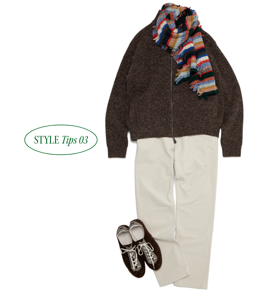 レザーの引き手が品よく映えるドライバーズニットを主役に、ブラウン×ホワイトの配色でまとめた上品なカジュアル。カラフルなマフラーが差し色になりつつ、メランジの表情がニットと自然に呼応する。素材の温もりが重なり合い、冬らしい奥行きのある着こなしに。どんなアウターにも穏やかに馴染む。