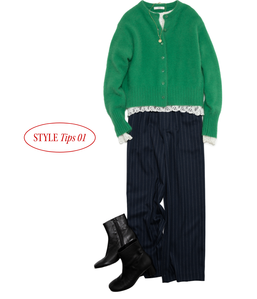 ふんわりと空気を含むフォックス100%のグリーンカーディガンに、繊細なレースのカットソーとジュエリーを重ねて、女性らしい余韻を添えて。そこにストライプパンツとショートブーツを合わせ、甘さを引き締めるようにハンサムなムードをひとさじ。凛とした表情を持つこのスタイルには、やわらかな素材や優しいトーンのアウターがよく似合う。