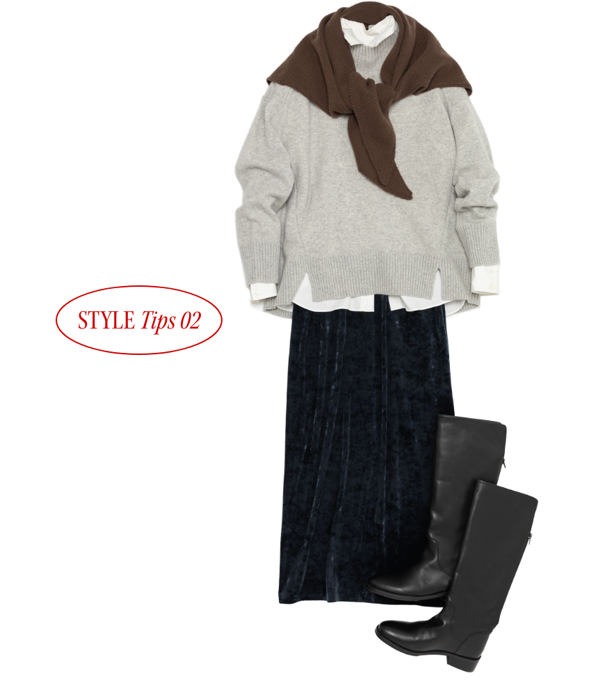 上質ラムウール×カシミヤのハイネックニットに、端正なシャツを重ねて。程よい肉感のニットなら、オックスフォードのオーバーシャツを重ねてもすっきり美しいシルエットが保てる。艶めくベロアスカートに、裾やスリットからロングブーツをのぞかせれば、今のバランスが完成。リッチな質感のウールコートや、キルティングジャケットと好相性。