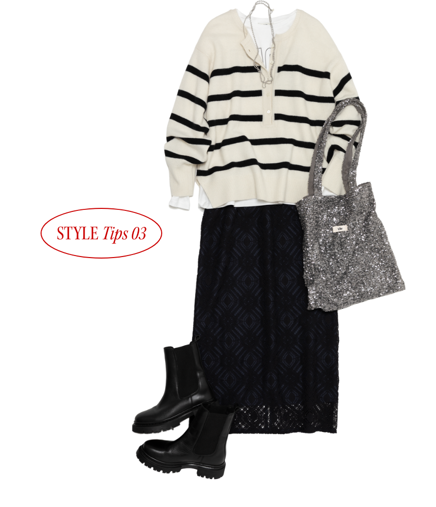 上質なラムウールにカシミヤをブレンドしたヘンリーネックニットに、カジュアルなTシャツをレイヤード。ネイビーボーダーと呼応するのは、幾何柄レースのスカートに透けてのぞく濃紺。眩いスパンコールのバッグでホリデームードを添えたら、抜け感のあるマリンスタイルが完成。仕上げはPコートで冬の風を軽やかに纏って。