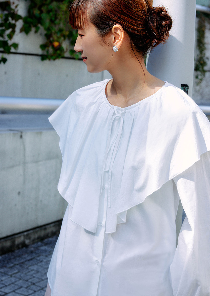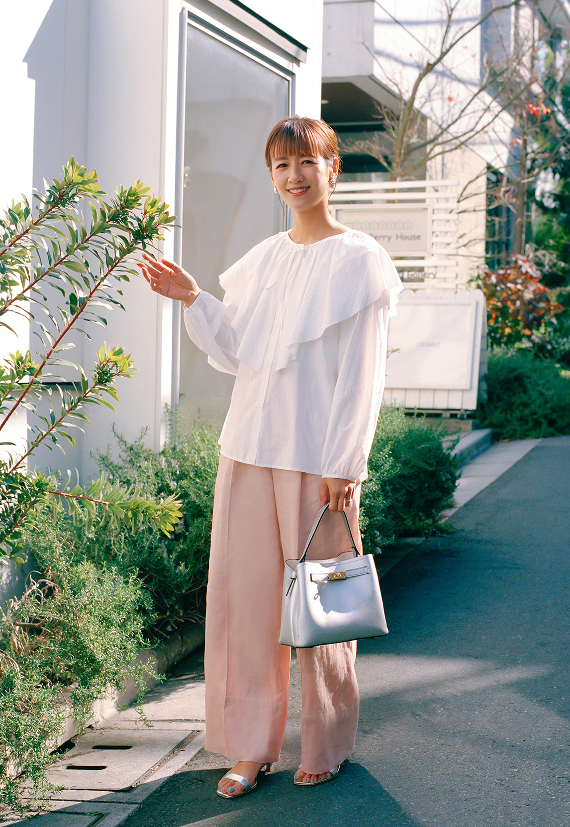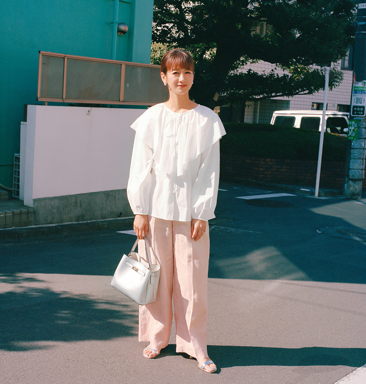 同じくらい定番なのが白いブラウスで、1枚で着るだけで華やかに。きちんとした打ち合わせがあるときは真っ先に袖を通します。
