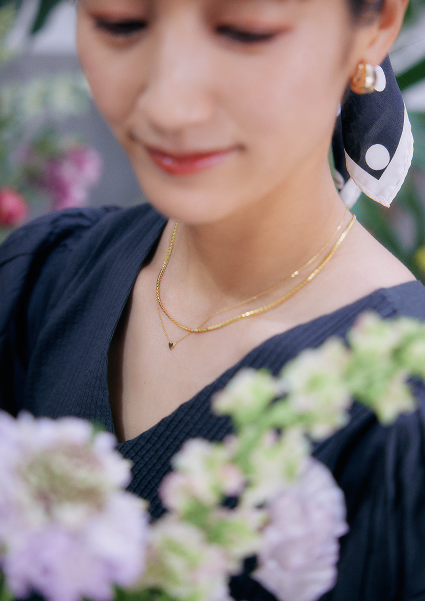 肌の色になじむゴールドのアクセサリーも欠かせません。今日つけているネックレスは、ゴールドアクセサリーが好きだった母から譲り受けたもの。大切な家族の思い出を身につけたくて選びました。