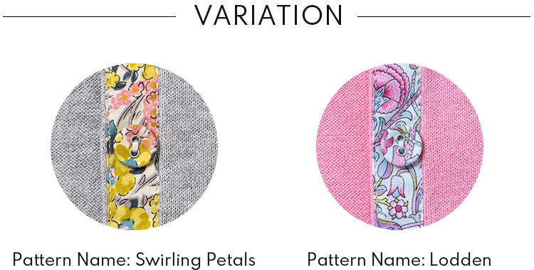 くるみボタンと前立てにリバティプリントを配した定番人気のカーディガン。2021年春夏の新色・レモンイエローと組み合わせたのは夏の庭園に次々に咲き誇る花々をひとつのデザインにまとめた柄のリバティ生地。全3色はそれぞれに異なるリバティ柄を採用しているのもポイント。