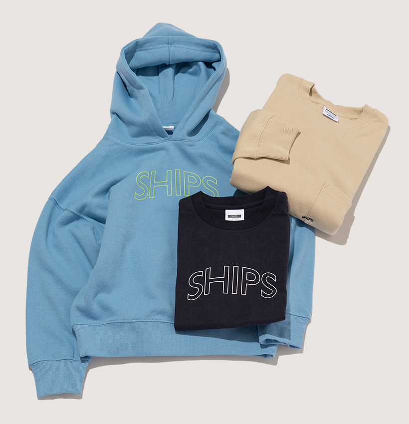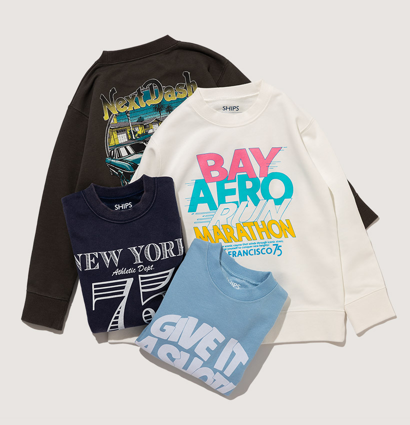 SHIPS設立50周年を記念してつくられた特別なスウェットシャツ。肌馴染みの良いコットン素材にヴィンテージ加工を施し、アメリカのローカルレースや大学大会、カスタムカーショップやクラブチームのユニフォームをイメージしたプリントが、どこか懐かしくて新鮮な表情を見せる。すべてのデザインに、ブランド創業年の「75」をあしらった、今季だけの限定アイテム。