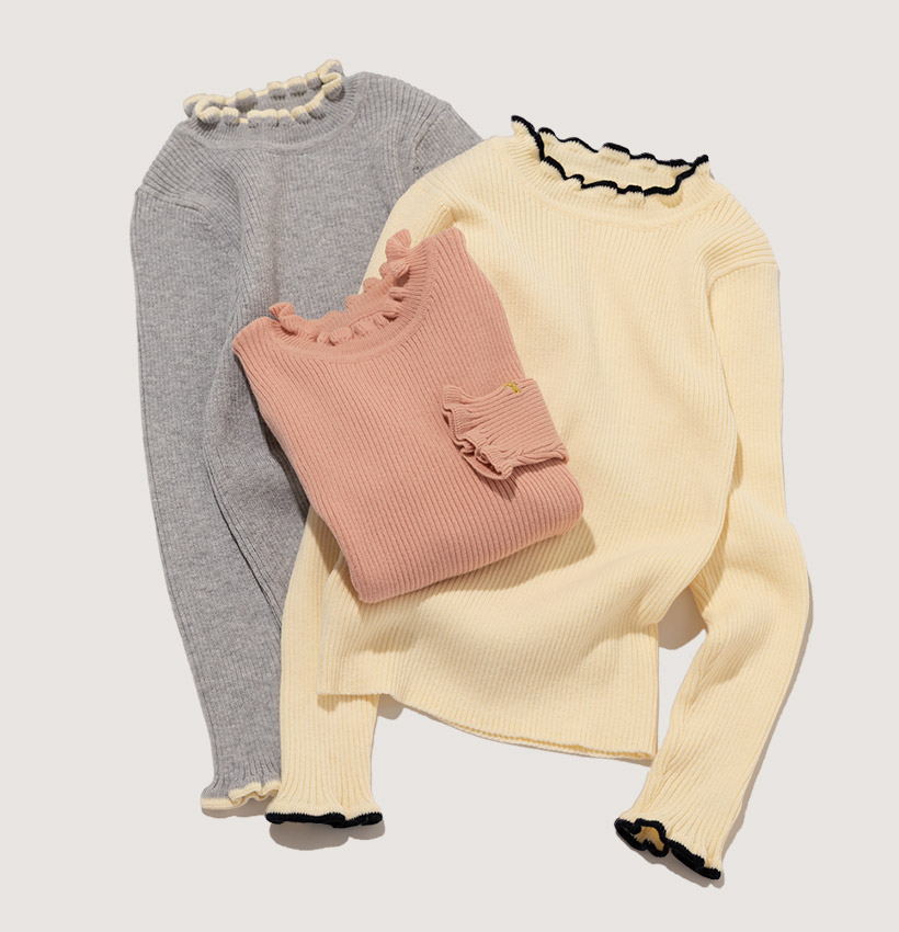 コットンナイロンの柔らかな生地で仕立てた、軽やかな着心地のリブトップス。首元のフリルがそっと顔まわりを彩り、すっきりとしたシルエットが女の子らしさを引き立てる一着。オフホワイトとグレーには、襟と袖口にパイピングをあしらい、さりげないアクセントに。防寒もおしゃれも叶うから、色違いで揃えたくなる優秀アイテム。