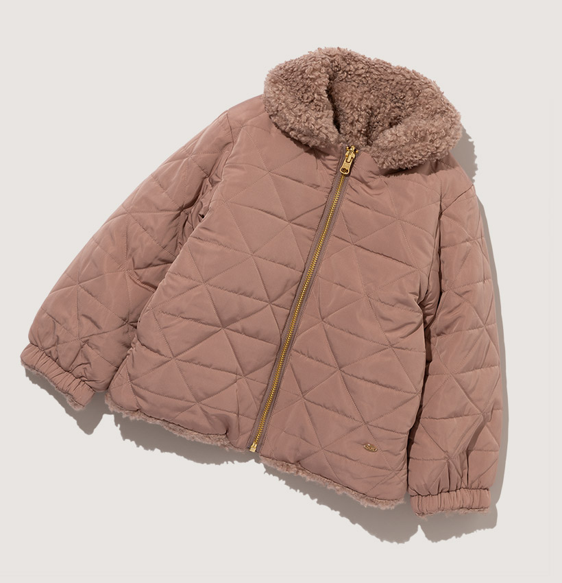 幾何学模様のキルトステッチとぽこぽこ膨らむボアの丸襟に、思わずため息が出る可愛いジャケット。光沢のあるタフタ生地とプードルのような細かいカールのボアを組み合わせたリバーシブル仕様で、表情を変えて楽しめる。両脇ポケット付き、袖口はゴム仕様で保温性も確保。ピンクがかった淡いブラウンとホワイトの2色展開で、冬のおでかけを華やかに彩る一着。