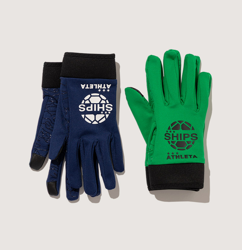 ブラジル発フットボールブランド〈ATHLETA〉のフィールドグローブ。細身でフィット感のあるストレッチ素材は、ごわつきを抑えつつスベリ止め加工でプレイも快適。親指・人差し指・中指はタッチパネル対応で、寒い日でもスマホ操作がスムーズに。SHIPSロゴ入りの別注カラーで見た目もスタイリッシュに決まり、手元から遊び心と快適さをプラスしてくれる。