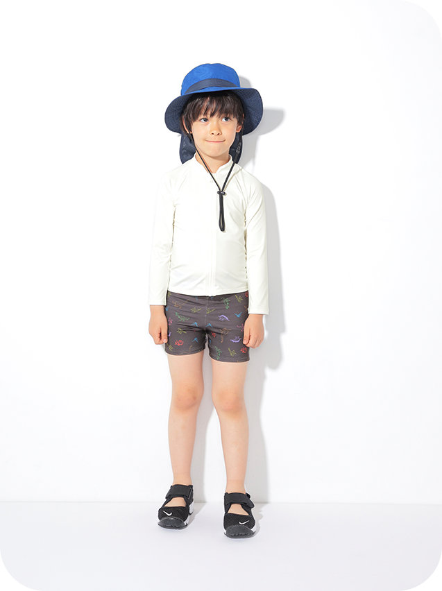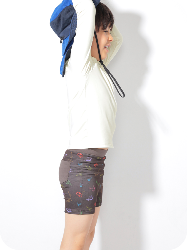 毎年人気のSHIPSオリジナルプリントシリーズ。男の子用には、みんなが大好きな恐竜モチーフを賑やかにあしらった、定番のぴったりショーツが登場。チャコールグレーをベースに、たくさんの種類の恐竜がカラフルに集う楽しい一枚。UVカット素材のラッシュガードと合わせて、ビーチでの小さな怪我や日焼け防止にも備えておこう。