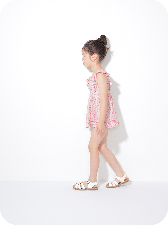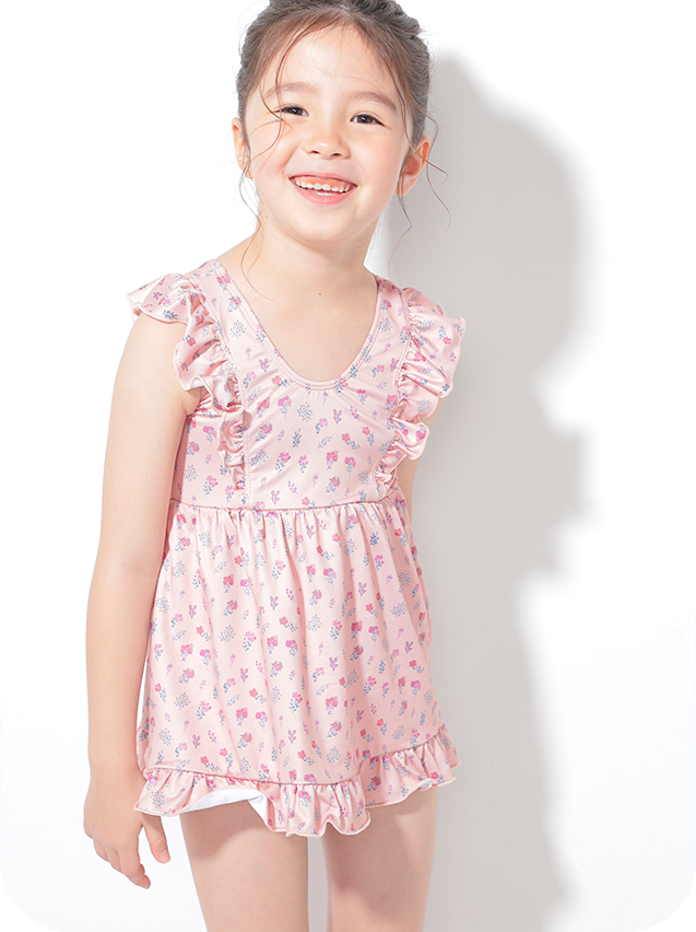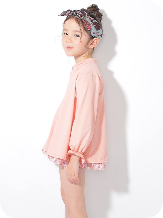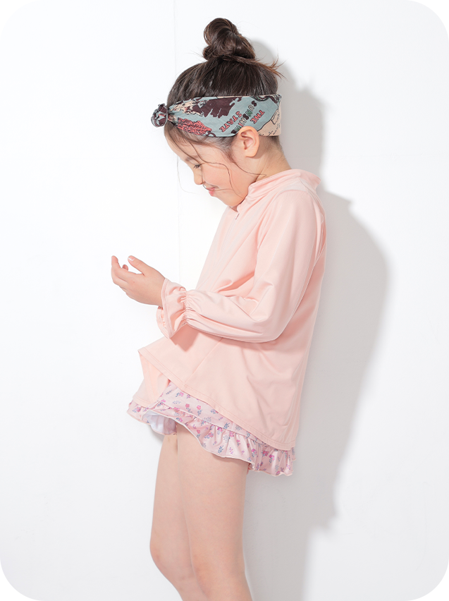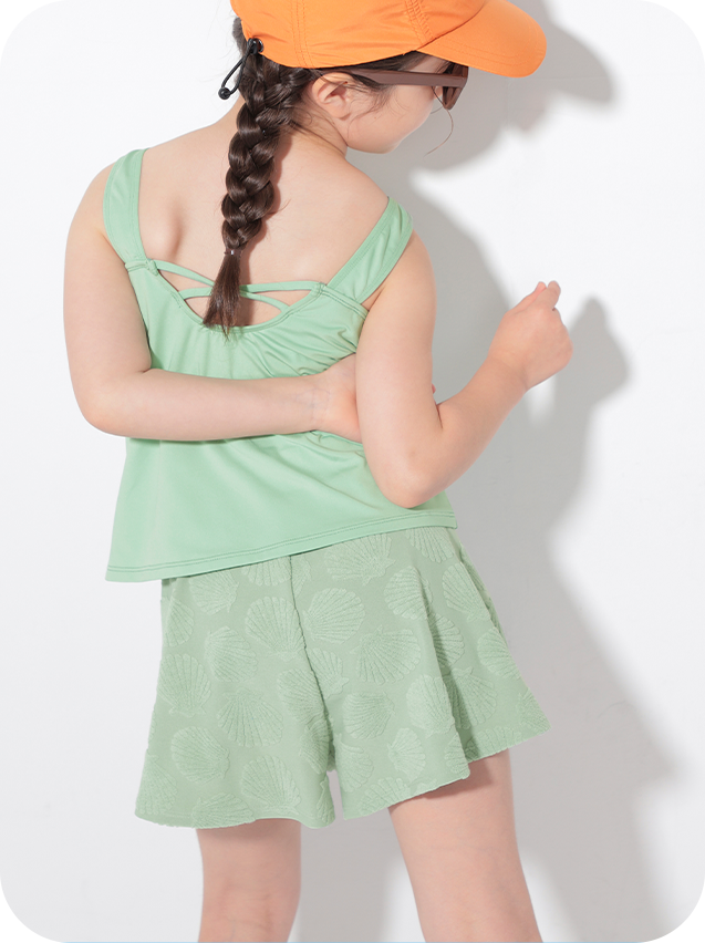 セパレートタイプでもオリジナルの新作が登場。大人っぽいセージグリーンを基調に、お腹が出ない着丈のプレーンなトップと立体感のある貝殻モチーフのボトムをセットで。トップのショルダーストラップは太めでずれ落ちにくいバッククロスデザイン、ボトムはショーツとキュロットの一体型と、上下とも安心設計。動きやすいスタイルで元気にビーチを駆け抜けて。