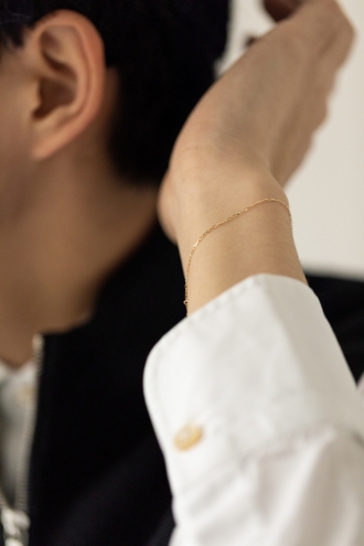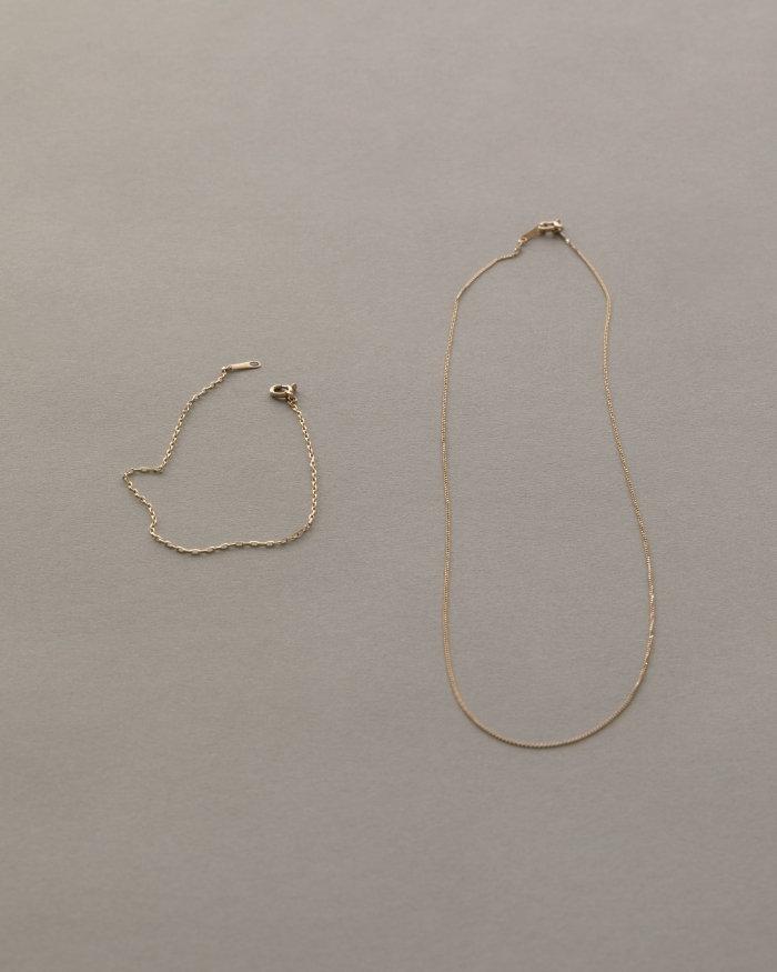 K10イエローゴールドを用いた、ネックレスとブレスレット。メッキや金張りではなく、耐久性に優れたK10素材を採用することで、変形や傷がつきにくく、日常生活の中でも気兼ねなく身につけられる。それぞれ異なるチェーンには繊細なカットを施し、光を受ける角度によって控えめながらも確かな輝きを放つ仕上がりに。シンプルで主張しすぎない佇まいは装いを選ばず、デイリーなスタイルに自然な馴染みを見せる。ネックレスとブレスレットどちらも単体でも重ねても成立する、完成度の高いジュエリーだ。