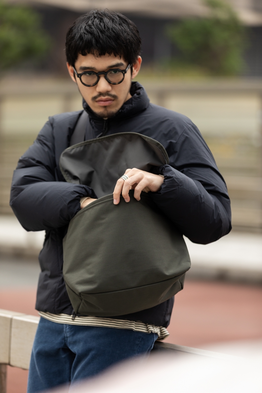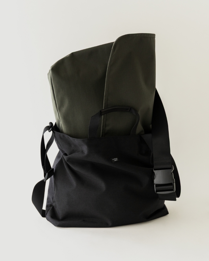 余白美を感じさせるクリーンなデザインで支持を集める〈STANDARD SUPPLY〉に別注した、ショルダー付きトートとメッセンジャーバッグ。通常生地よりもハリがあり、撥水性などの機能を備えたコーデュラスパン素材を採用している。いずれも大容量の収納スペースを備え、荷物が多い日でも安心。内側には大きなポケットを配し、使い勝手にも抜かりがない。装飾を削ぎ落とし、本質を見極めた佇まいが、長く使い続けたくなる理由だ。