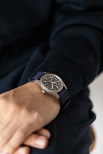 1892年の創業以来、実用性と精度を追求し続けてきた〈HAMILTON〉の名作「カーキ フィールド メカ」。SHIPS 50周年のステートメント「青いまま進む。」に重ね、SHIPSカラーを落とし込んだ特別仕様に仕上げた。手巻きムーブメントを搭載したミリタリーウォッチ由来の確かな機能性に、1960年代を思わせるヴィンテージライクな表情をさりげなく加えている。裏蓋に刻まれた“for SHIPS”の文字も、静かなアクセントに。日常に自然と溶け込み、使い込むほどに佇まいに味わいを深めていく一本だ。