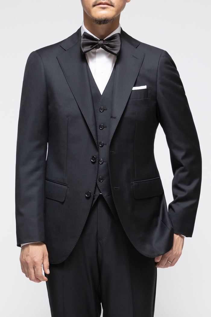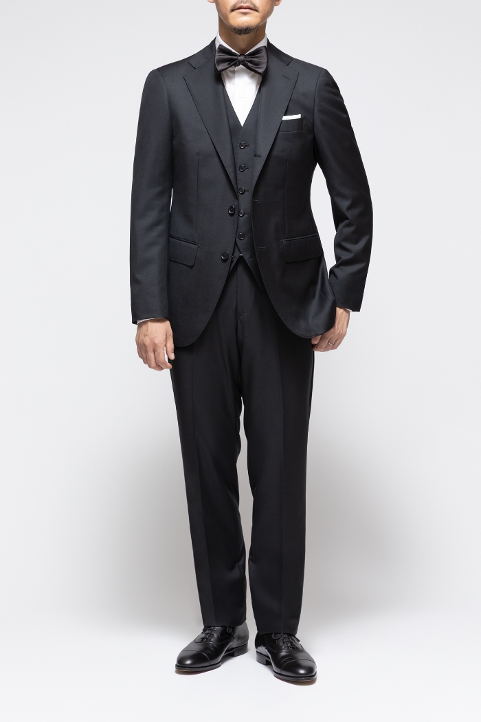 ファーストシーズンである2025年AWは、「スーパーブラック」「ネイビー」「ブルー」「グレー」の4色を展開。すべて無地ながら、微妙な発色の違いにこだわりました。ちなみにスーパーブラックのみ、艶を控えめにする仕上げを採用。冠婚葬祭すべてに対応するブラックスーツとしてつくり込んでいます。