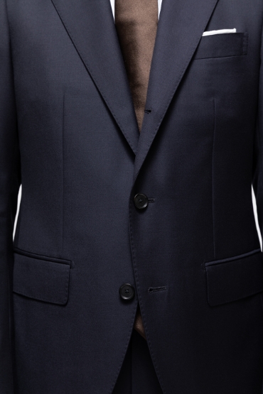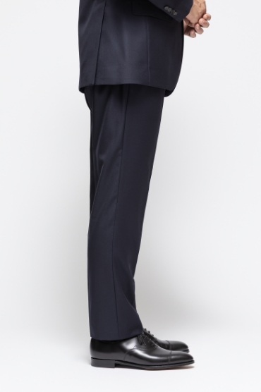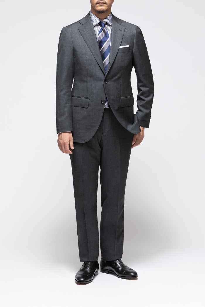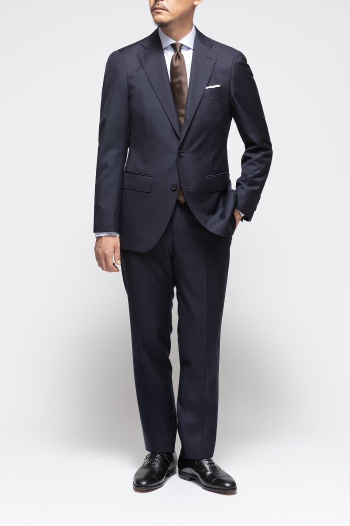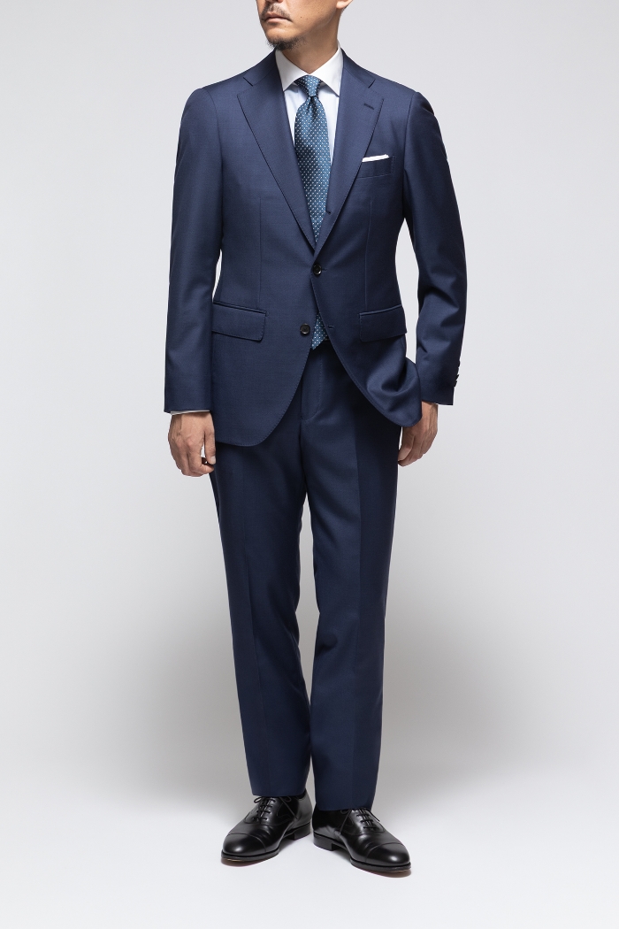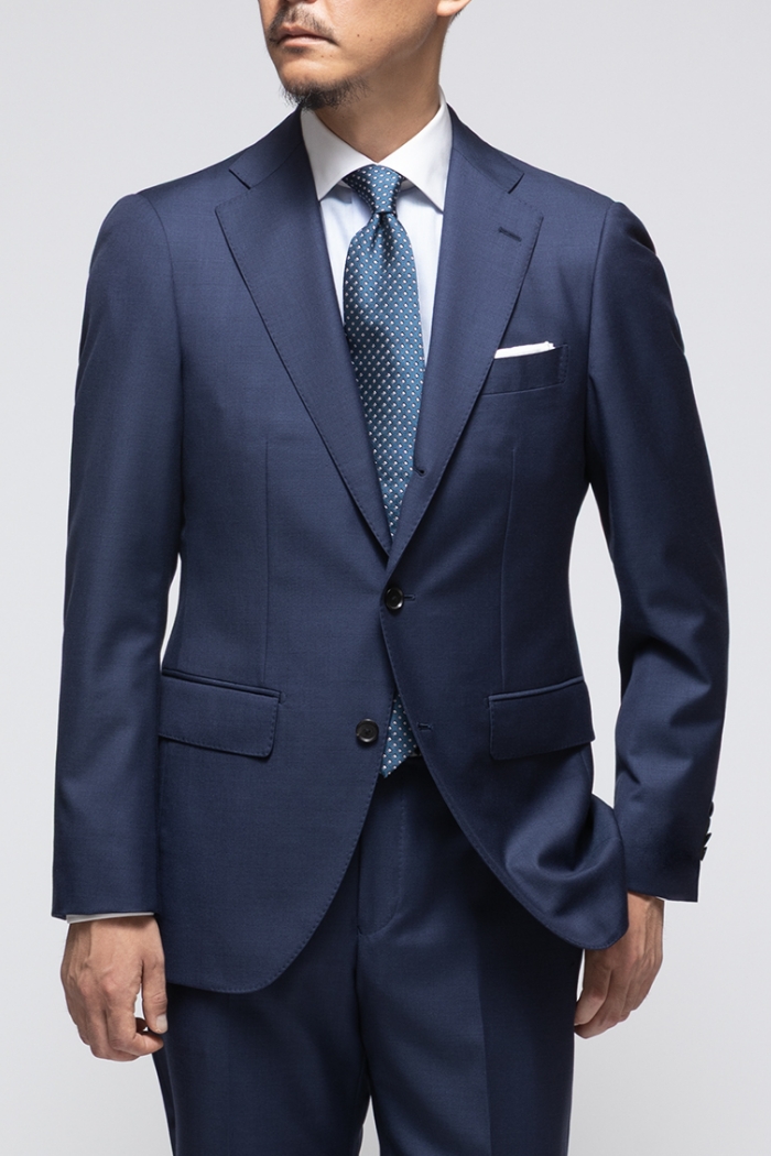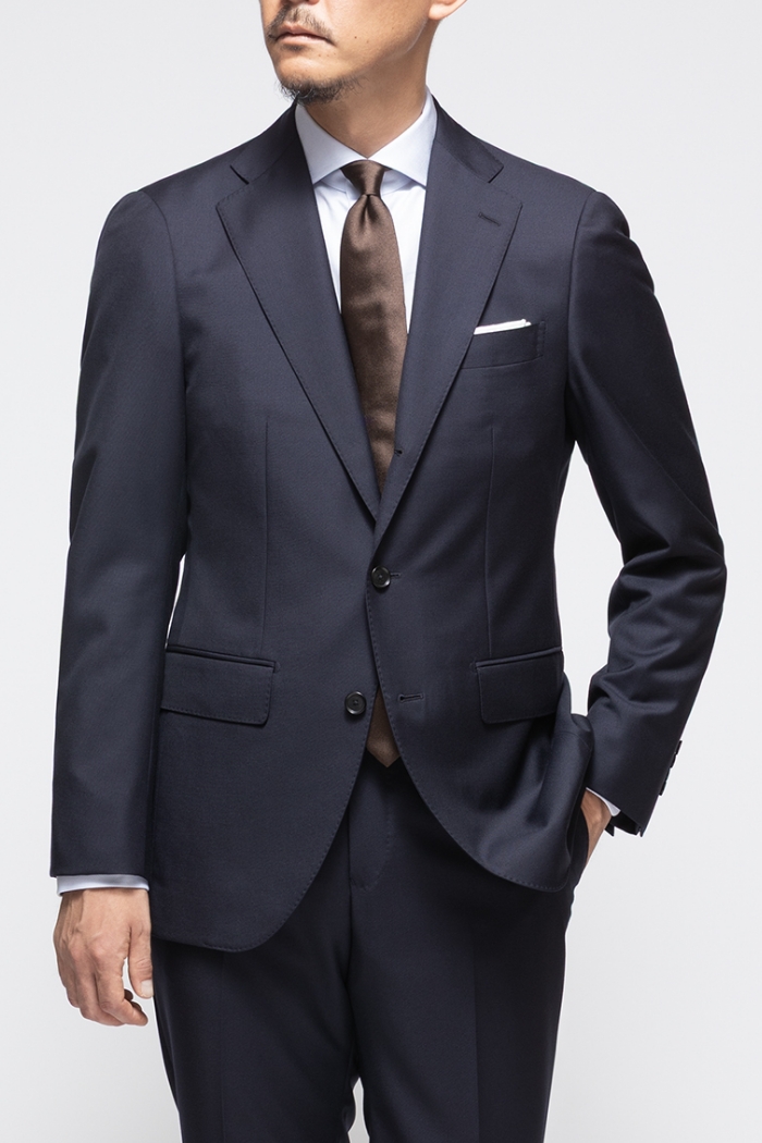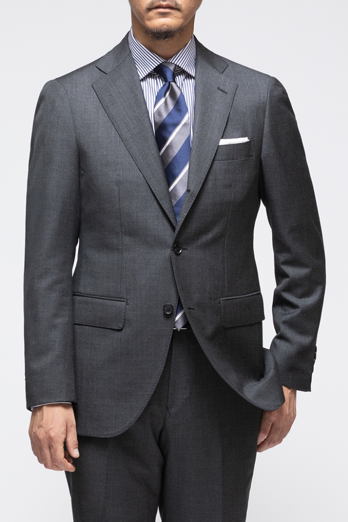 フロントも現在のスタンダードである3つボタン段返り。ウエストは自然にシェイプアップし、美しい着姿を演出。とはいえタイトに攻めすぎず、スーツに不可欠なゆとりも確保しています。