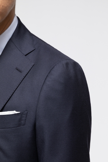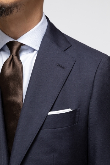 スーツの顔となるのが襟周り。ラペルは細すぎず太すぎずの中庸な幅に、上襟とラペルの継ぎ目であるゴージラインも、高すぎず低すぎずの位置に設定しました。どちらも現代の王道を狙い、幅広いシーンやスタイルにマッチするよう計算しています。
