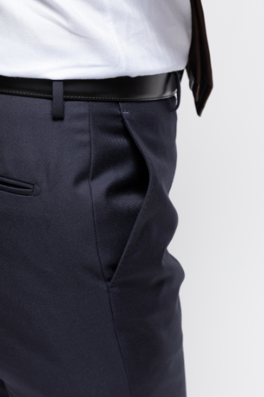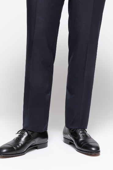 スーツの場合、パンツが短すぎるのは好ましくありません。裾が足の甲に少しだけかかる「ハーフクッション」、または裾がぎりぎり甲にかからない「ノークッション」が今の主流で、前者はクラシック、後者はすっきりとした印象に仕上がります。