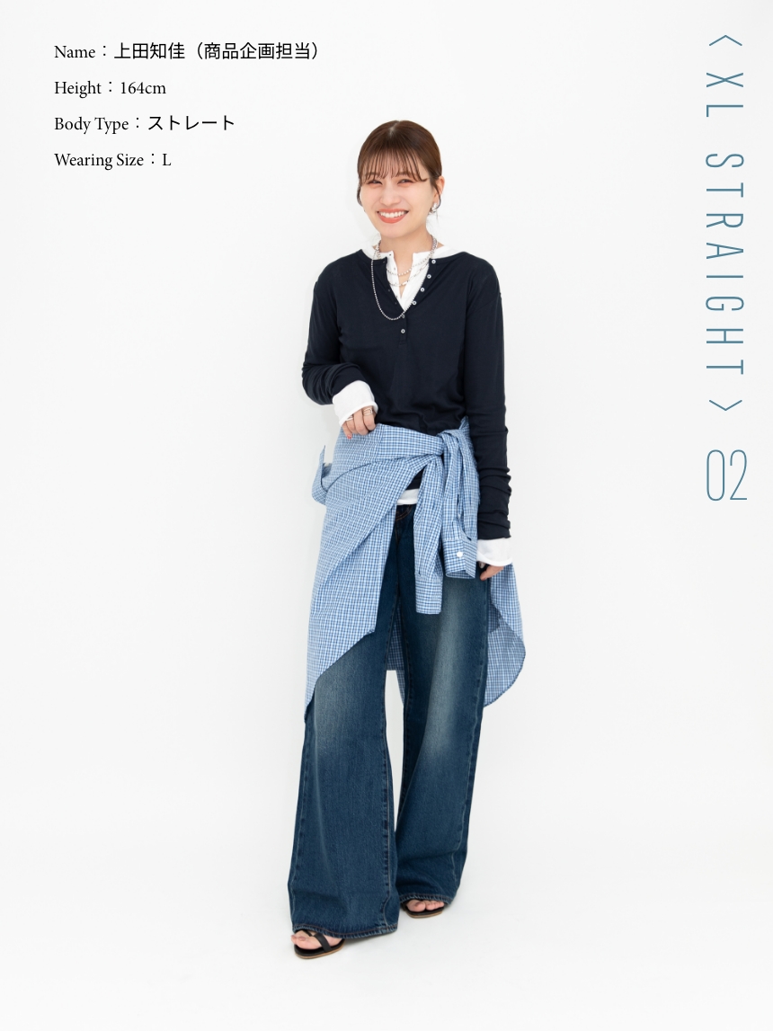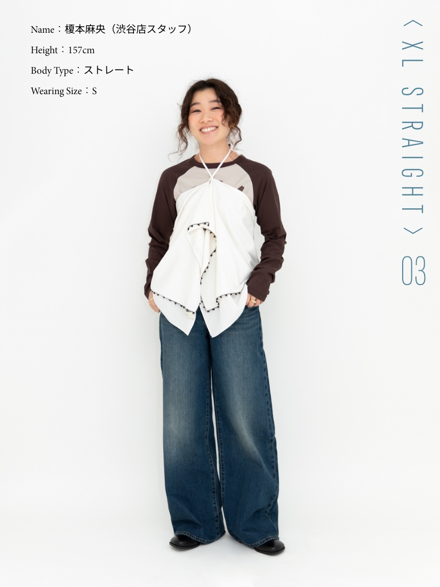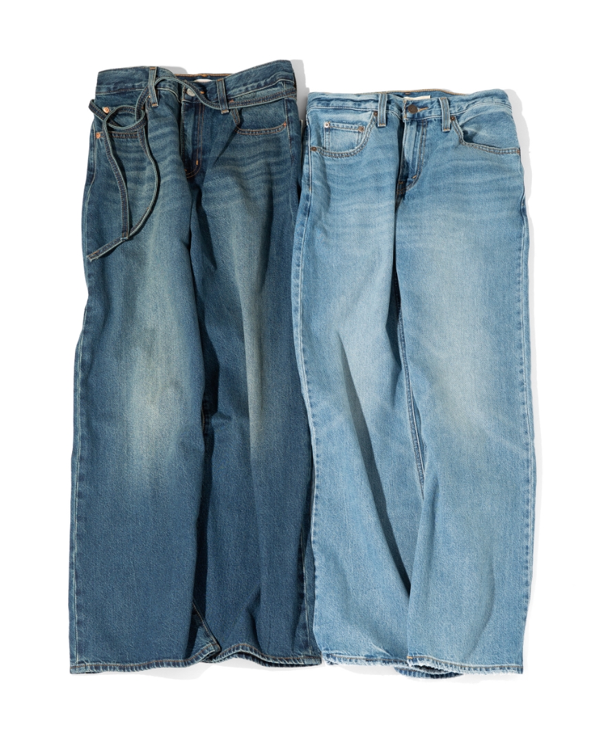 左)オーバーサイズのバギーシルエットに、幅広のストレートレッグを掛け合わせた「XL STRAIGHT」。ウエストバンド付きで、好みのフィット感に調整できる。ゆとりがありながらもラインはすっきりと、脚を美しく見せる一本。