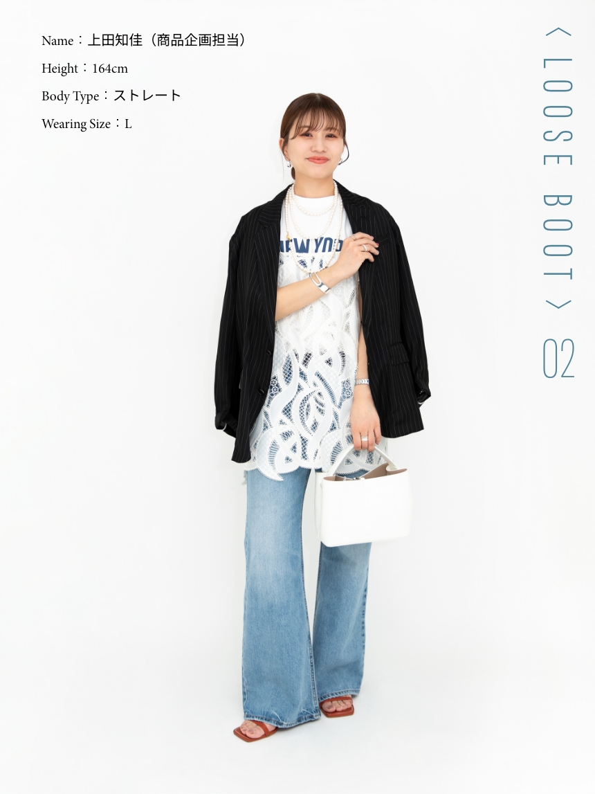 タフなデニムとオーバーサイズのジャケットに、レースとパールを合わせてコントラストを出しました。ストンと落ちるすっきりとしたシルエットなので、トップスはややオーバーサイズを選んで上下のバランスを意識。全体はクリーンな印象にまとめています。脚のラインがきれいに出るので、きれいめな合わせも相性がいいと思います。