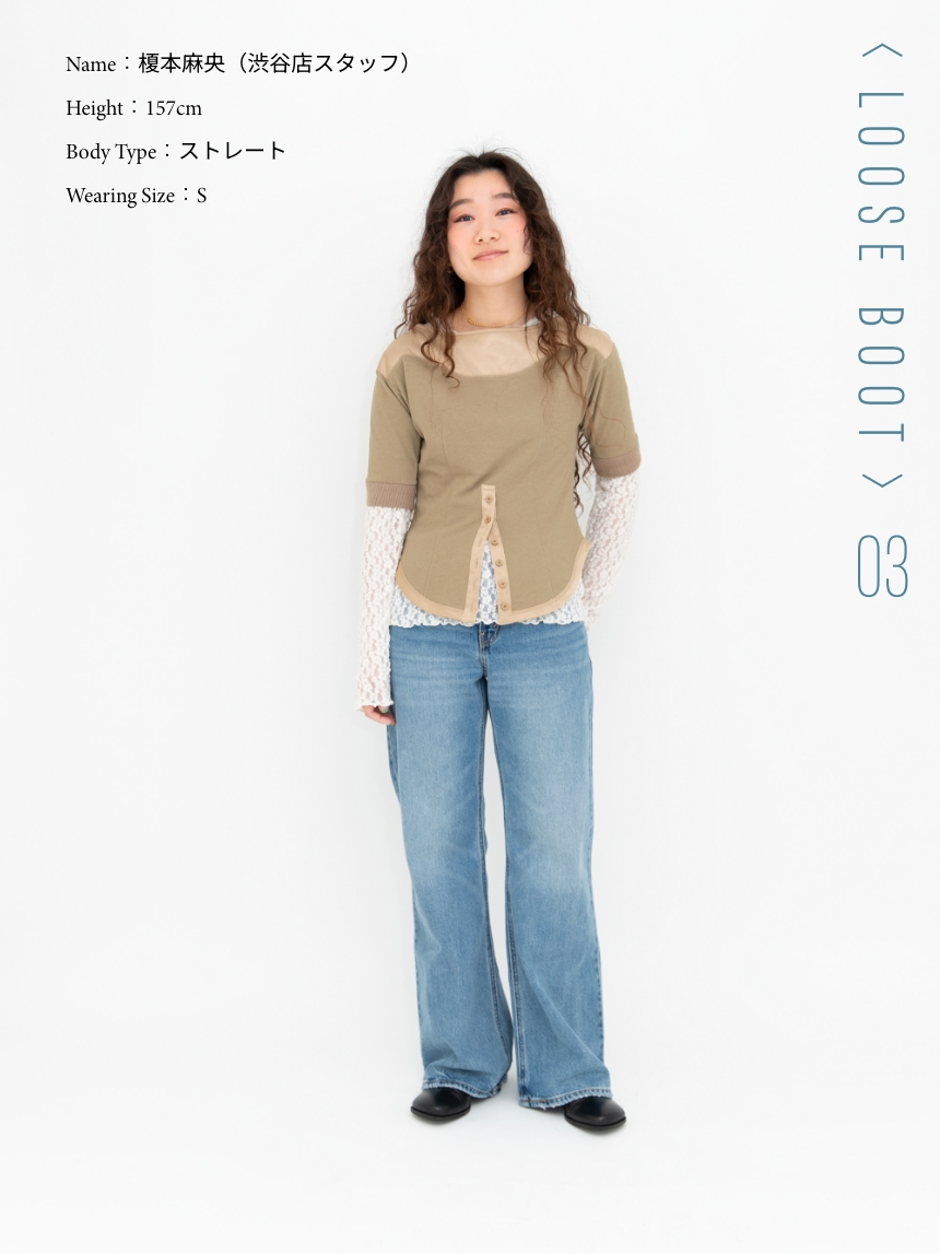 榎本 マイ・ルールは、デニムのシルエットをきれいに見せるために全体のバランスを大切にすること。ウエストまわりを程よく見せて、スタイルアップも意識しています。今季のミッドライズには、ヘルシーなクロップド丈やレースアイテムを合わせて、ルーズなシルエットに抜け感を足した着こなしが気になります。