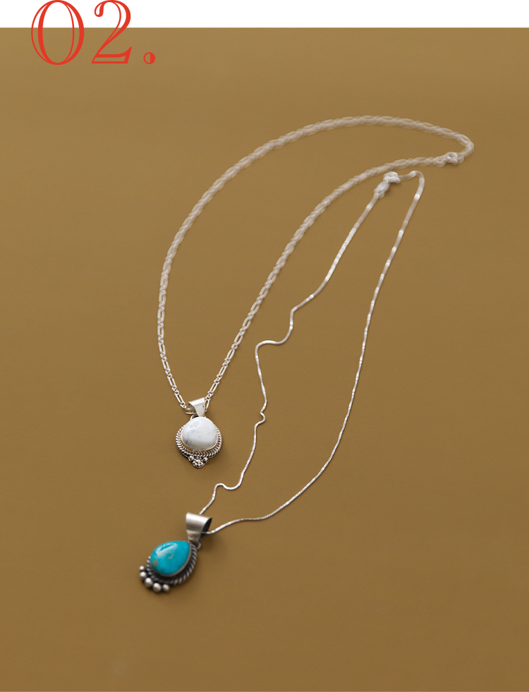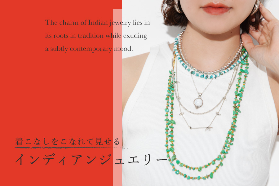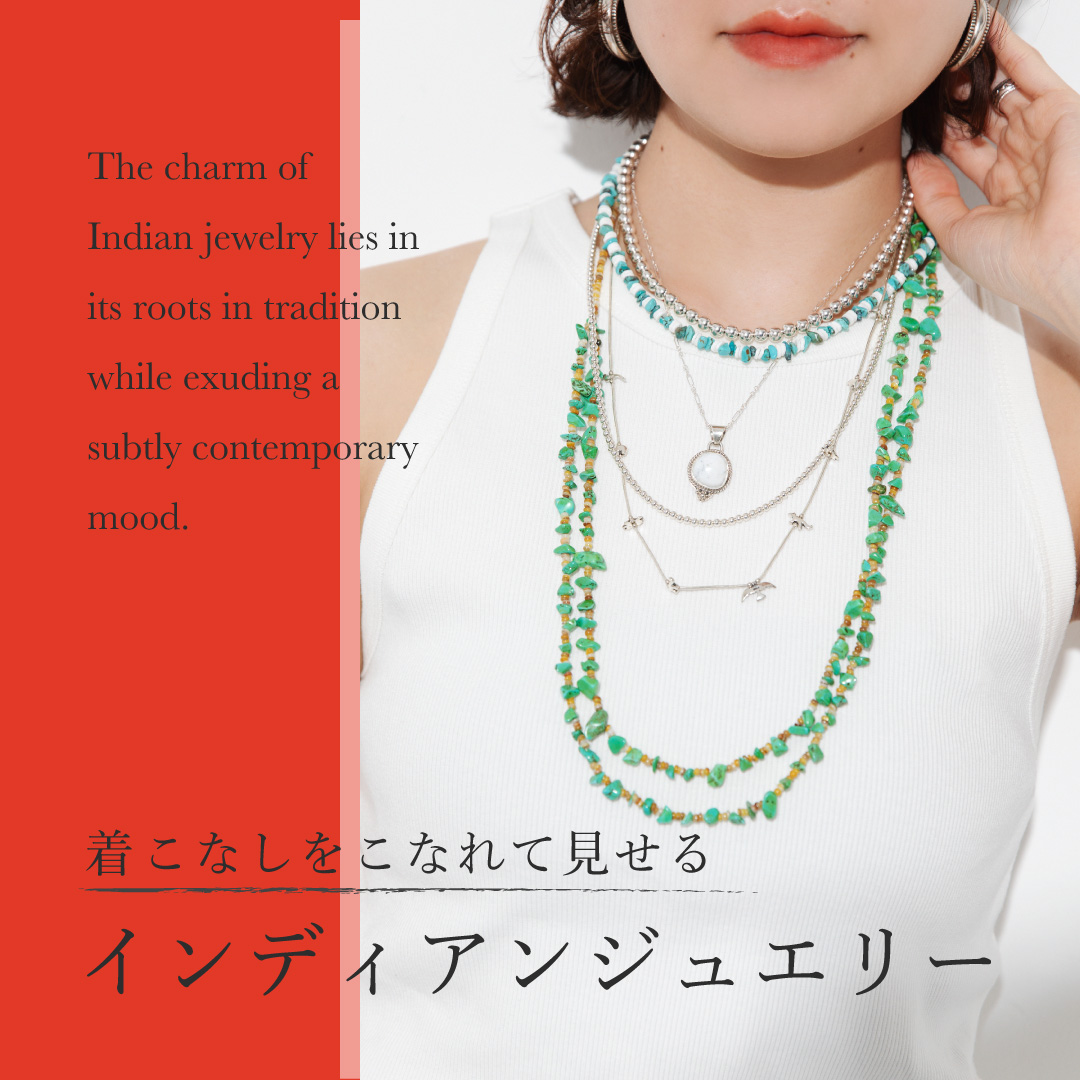 夏の主戦力であるTシャツやタンクトップを軸に、インディアンジュエリーを一点投入するなら断然ネックレス。今回はネックレスにフォーカスして、さまざまなタイプを一挙にお届け。「愛用ジュエリーとの重ね技」も参考に、エンパワメントしてくれるアイテムを探して。