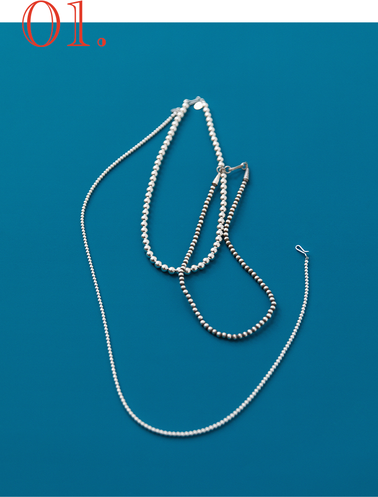 アメリカ南西部のナバホ族によって手作業で作られた、伝統的な金属工芸の技術が息づくシルバー製のビーズジュエリー。クラシックな気品を纏うパール(真珠)に対して、ナバホパールはモダンなエッジと力強さを宿すように、繊細さの中に意志を秘めた新しい時代のエレガンス。ネイティブスピリットと現代的なスタイルが融合したムードは、粒の大きさや長さで異なるニュアンスが楽しめる。