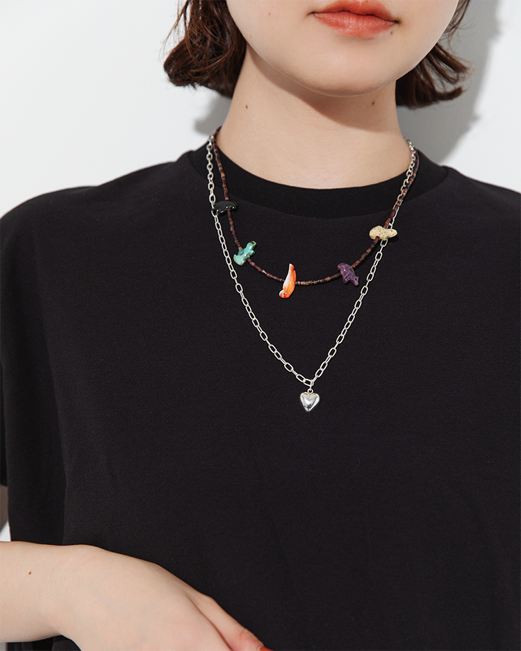 さりげないハートトップのチェーンネックレスにカラフルなフェティッシュネックレスを重ねて、チャーミングな女性像に。毎年夏になると着たくなるエターナルでシックな黒にも映える、遊び心のある首元が完成。
