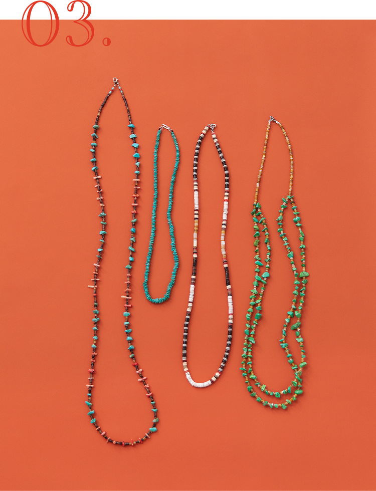 ネイティブアメリカンの文化に深く根ざしたビーズネックレスは、色彩や素材が語りかけてくるような、装飾を超えたジュエリー。整然と並んだ、均整の取れた美しさの中に力強さを秘めたストランドタイプや、小さく不規則な形が連なった、動きとともに軽やかに揺れるヒシタイプなど、それぞれの個性がお守りのように寄り添ってくれる。