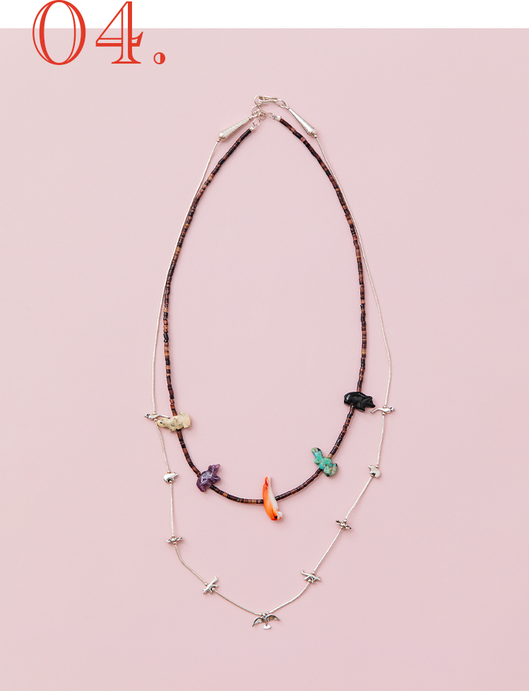 アニマルシェイプのシルバーパーツや小さな石などを連ねた「フェティッシュネックレス」。シルバー925のタイプと、インディアンジュエリーに使われる代表的な天然素材(シェル、ターコイズ、パイプストーン、サーペンタイン、ジェット)を使ったタイプで、素朴な美しさと静かな存在感を放つ。スピリチュアルな意味を持つ動物の種類や色がアソートなのも楽しい。