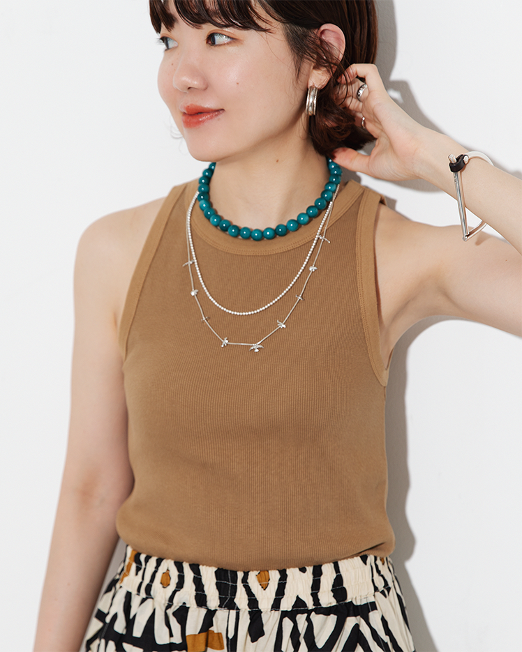 ラクトビーズを使用したチョーカータイプで人気のボリュームネックレスに、女性らしい繊細さのあるインディアンジュエリーを重ねて。ミニマル志向や上品さを演出してくれる理想のおしゃれ感。