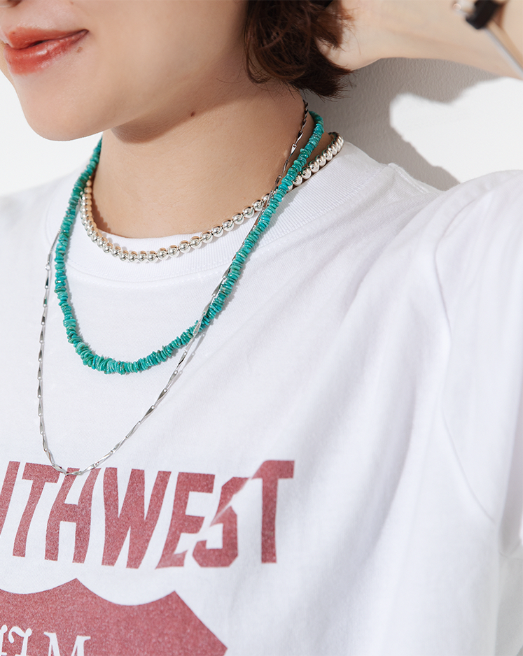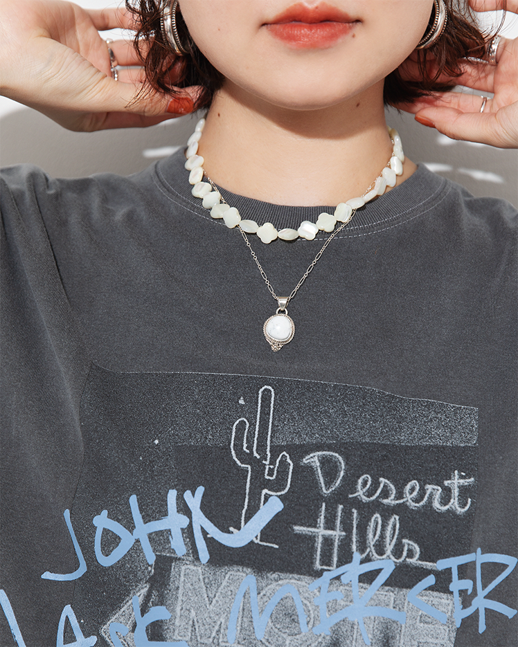 ヴィンテージのようなプリントTシャツのカジュアルさを、都会的にこなれて見せる3つの重ね技。ナバホパールがターコイズビーズやシルバーチェーンとのレイヤードをリズミカルにまとめてくれる。