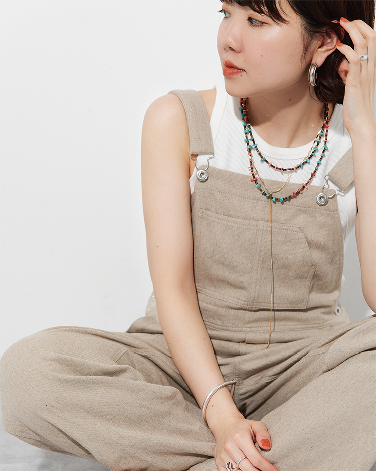 抜け感のあるオールインワン・スタイルに女性らしさをひとさじ。華奢なゴールドチェーンだけの物足りなさを埋めてくれるナバホビーズのネックレスは、100cmのロングタイプを二重にアレンジ。