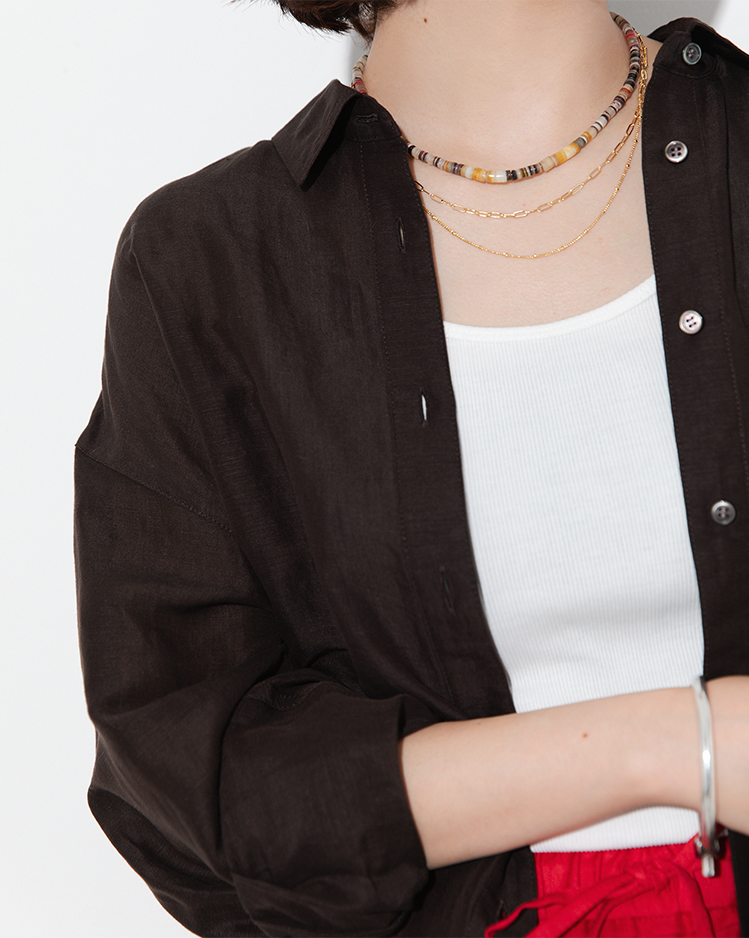 リネンシャツの襟を抜いた着こなしから覗く首元に、サントドミンゴビーズで夏らしい季節感を添えて。繊細なゴールドチェーンと、コーラルやシェルなどの天然素材が調和した、聡明で女性らしい雰囲気に。