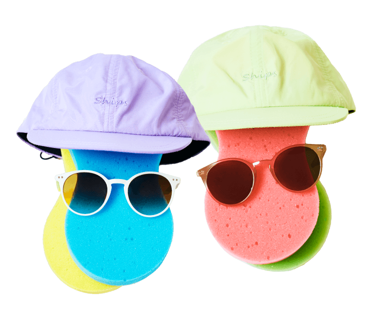夏の光に負けない、あざやかなビタミンカラーのキャップ。バックにはスピンドルゴム付きで、サイズ調整もかんたん!ボストン型のサングラスはお顔になじみやすくって、大人っぽいね。兄妹やおともだちとおそろいにするのもおすすめだよ。