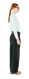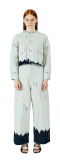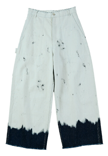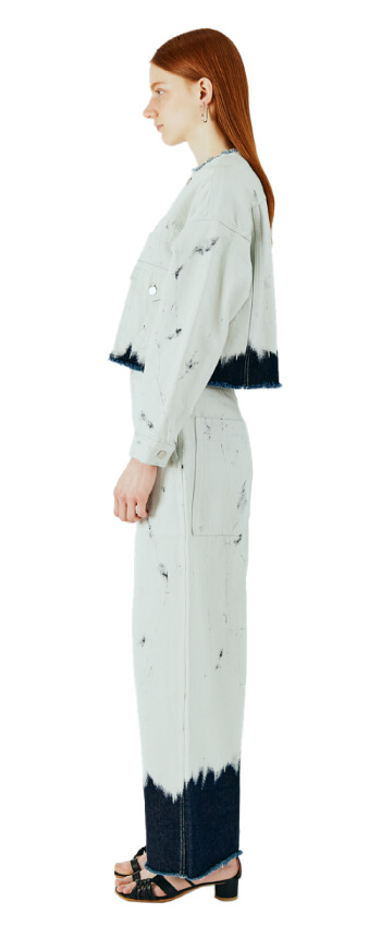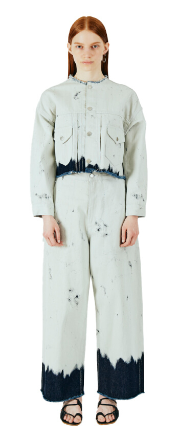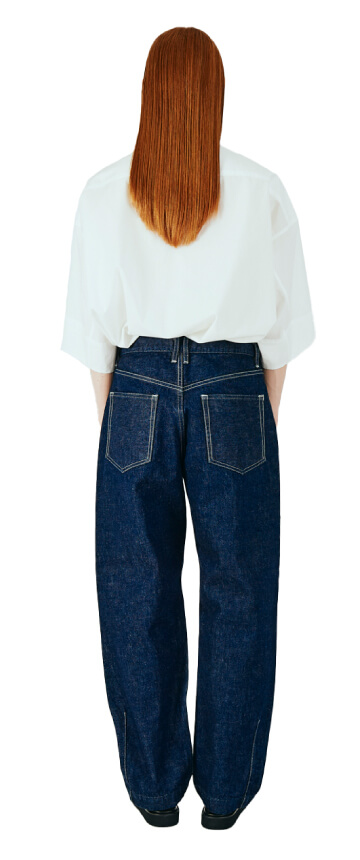 京都の染工場の技術を駆使し、インディゴを抜き染めすることで生まれたツートーンのワイドデニム。カジュアルになりがちなブリーチ技法ですが、裾以外すべてに施すことでモードな表情に。裾が濃色になることでクロップド丈が引き立つ効果もあります。大きめなバックポケットもアクセントに。デザイナー清水一子さんが今シーズンのコレクション作りに強いインスピレーションを受けたというグラデーションカラーをお楽しみください。