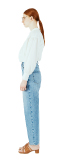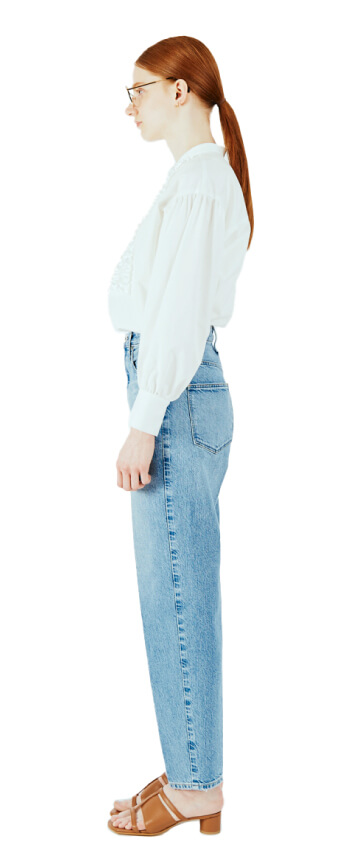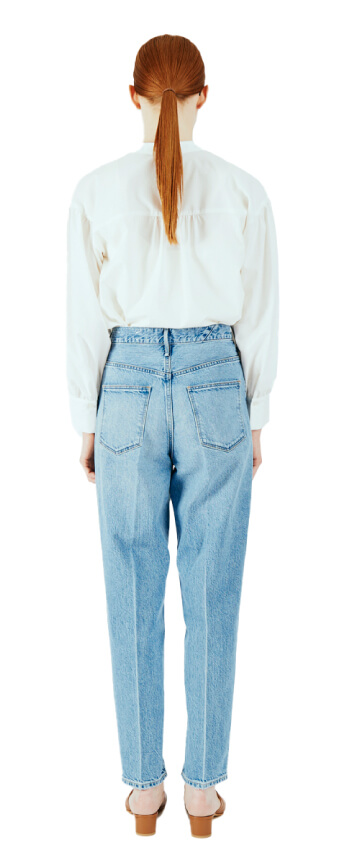 腰まわりにゆとりがありつつ、膝下が脚長に見えるシルエットが特徴的な〈upper hights〉の新定番「THE MISS」。ヒップから裾にかけてゆるやかな曲線を描くことで、動いたりしゃがんだりしてもつっぱりにくくストレスフリーなんです。センタープレスでさりげなく美脚になるのもうれしいポイント。明るいカラーと程よい加工で、大人の春デニムにぴったり。着る人を引き立てることに重きを置くブランドならではの1本です。