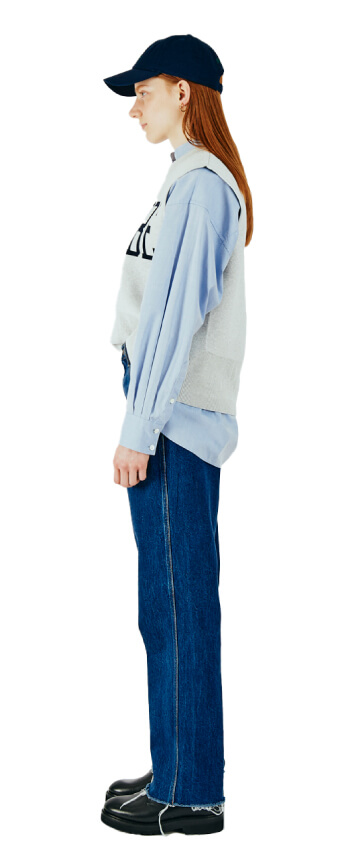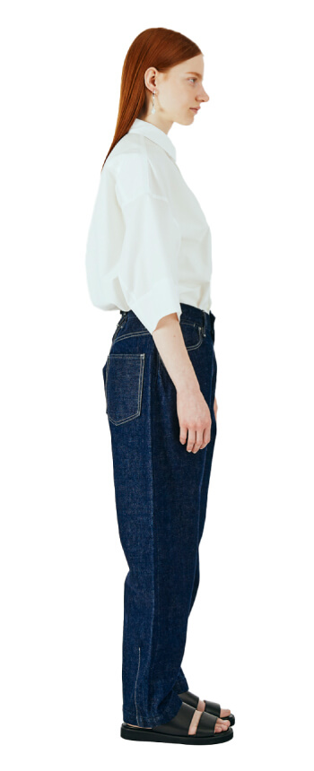 ヒップ部分のヨークはステッチを3本で取っていたり、サイドを巻き縫いするなど、ヴィンテージデニムのディテールを再現。50年代のアーカイブのような表情はそのままに、ストレッチ生地を採用して穿きやすさを実現しています。またセンタープレスを仕込んだり、裾のカットオフが活きるジャスト丈を採用することで自然と美脚になれるのもうれしいところ。トップスはインしてまっすぐなシルエットをアピールするスタイリングがおすすめ。