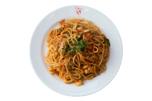 まるでローマの裏路地にあるようなイタリア料理店は、約70年前にオープン。最初は1Fのみだったが、繁盛していくうちに地下にも店舗を広げたという。懐かしいチェックのテーブルクロス、天井から吊るされるキャンティワインのボトル。歴史が感じられるひとつひとつが、定番メニューの「海老と野菜のナポリタン」をよりレトロな味わいに引き立ててくれる。とはいえオーナーシェフの折田さんは、70年代にヴェルサイユとローマで修行してきた。つまり本格的ってことだ。ランチメニューはパスタ4種、ピッツァ、ラザーニアなどから選べて、ボリュームもそこそこ。店内も広いし、サーブも早めなのも、人が集まる理由の一つ。ドルチェもSNSで話題になって以来、目当てに来るお客さんも多いそうだ。