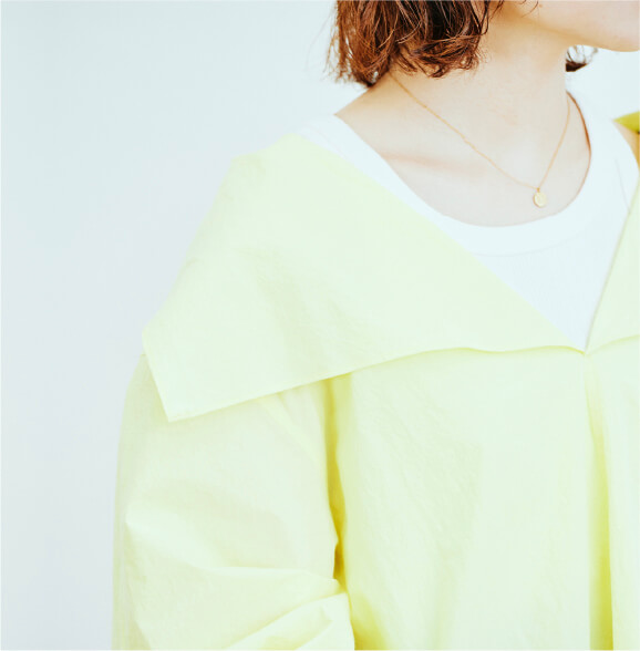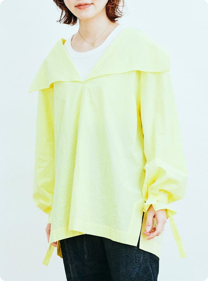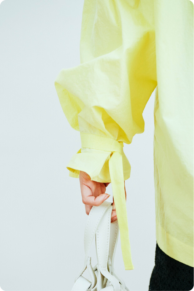 〈ESLOW〉で毎シーズン人気のあるコットンのタイプライター素材を使用しました。鮮やかなミモザカラーはインラインでは作ったことがありませんでしたが、素材とマッチして華のあるブラウスに仕上がりました。少し苦労しましたが、ミモザの花の様なくすみのない色合いを再現できたと思います。シルエットはゆとりがあってリラックス感のあるサイジング。大ぶりのセーラーカラーと、リボンを巻きつけたような袖のデザインが特徴です。