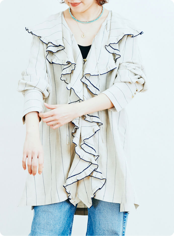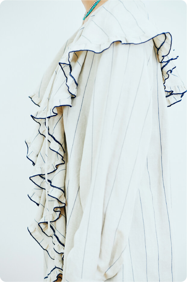 ワイド幅のピンストライプで、写真の配色と、ネイビーベースに白い線が入るものの2色展開です。リネン混で軽く着ていただけますし、扱いやすい素材だと思います。〈Uhr〉の服自体がものすごく用尺を使うようなデザインが多いのですが、このラッフルも中途半端にやるとかわいいだけで終わってしまうので、できる限り大ぶりに仕上げています。マニッシュなスタイルにも合うようにバランスをすごく考えて作りました。また胸が深めにV字で空いているので、子供っぽくならないところもポイントです。