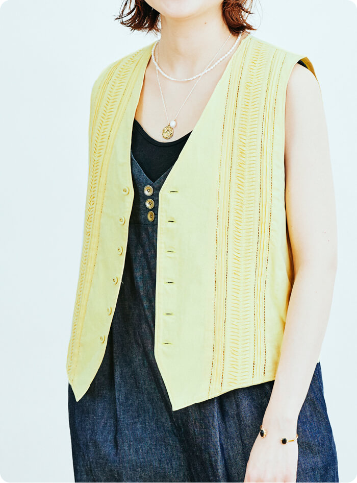 同じTrinityシリーズのシャツドレスと同色を重ねて着用したいです。インドを代表する男性用民族衣装の「クルタシャツ」も、同素材のベストを重ね着しているスタイルをよく見かけるので。そのスタイルを〈Pheeta〉なりの解釈でスタイリングしてみたいと思います。