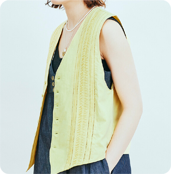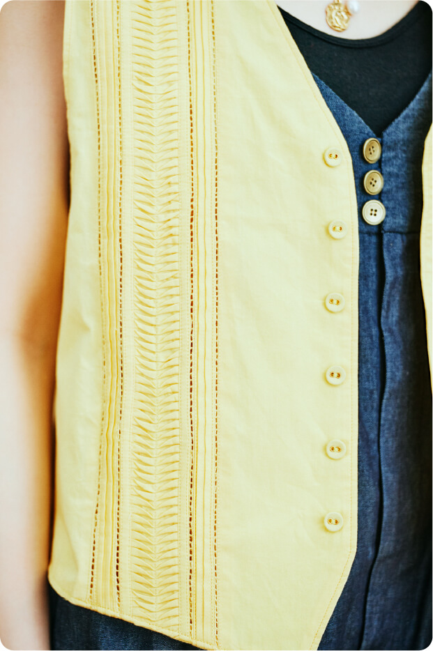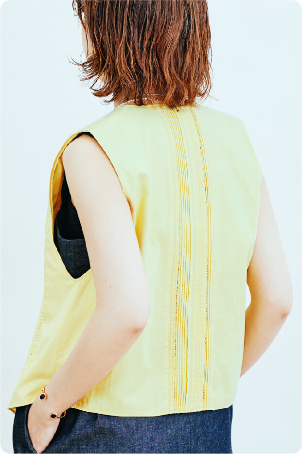 ピンタックが特徴的なこのTrinityシリーズは、元々メンズのフォーマルなドレスシャツである“ブザムシャツ”を、女性の日常に取り入れてもらいたいと思い制作しているシリーズです。胸まわりを切り替えたディテールは本来のブザムシャツに忠実にならい、手仕事のピンタックで表現してるのがシリーズを通じての特徴です。今回のアイテムも、メンズのフォーマルなベストを着想元とし、現代的に仕立てました。素材は、太番手のオーガニックコットンを平織りしたインド製のポプリンを使用しています。ベストというアイテムは、これまでTrinityシリーズのインラインでは作ったことのない形なので、とても新鮮です。装いに取り入れることで、女性ならではの着こなしの楽しさを感じていただければ嬉しいです。
