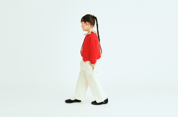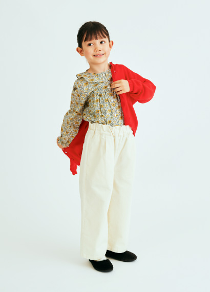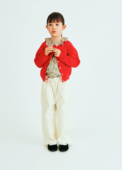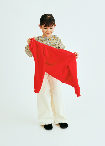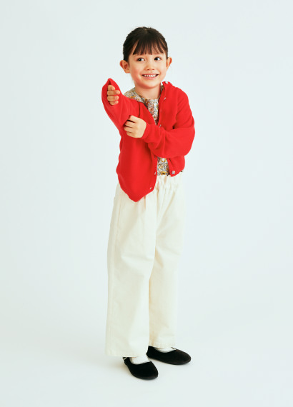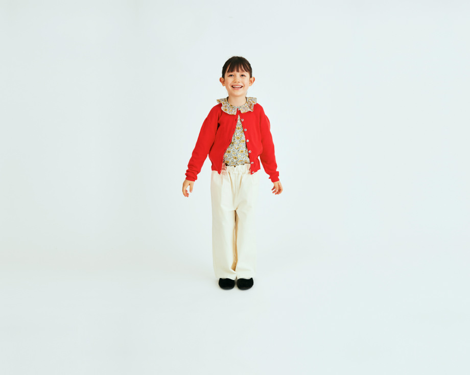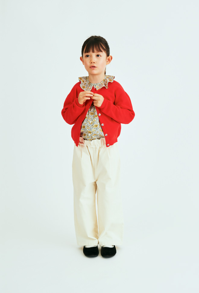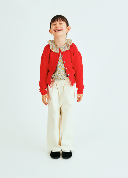 そしてキッズは、ママ以上に花柄がだいすき。SHIPSの定番のカーディガンのポイントは、ボタンにリバティ柄を使っているところ。リバティプリントとは、ロンドンの歴史あるテキスタイルブランドのこと。ボタンを留めずにはおっても、キュートにまとまります。