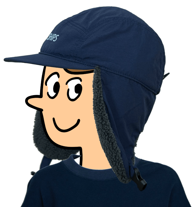 飛行機に乗るアーミーさんが、こういうの被ってて、寒い場所でも耳が隠れるのがいいんだ。裏地はフリースで、表地は水をはじいてくれる生地。耳当てを使わない時は、上にあげてパチンと留めておけるんだ。