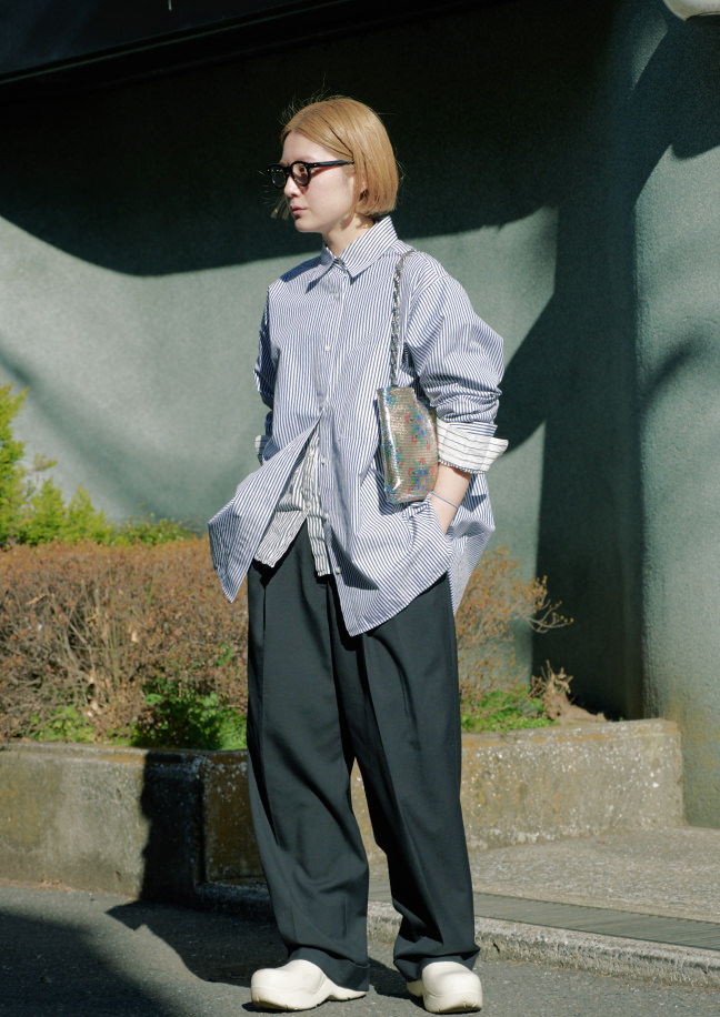 シャツ1枚の場合はスウェットパンツが多いです。全体的には今日みたいなダボっとしたパンツなど下重心のシルエットにするバランスが好き。あと髪がハイトーンなので、シャツが白ベースのときはメガネやサングラスを締め色にします。
