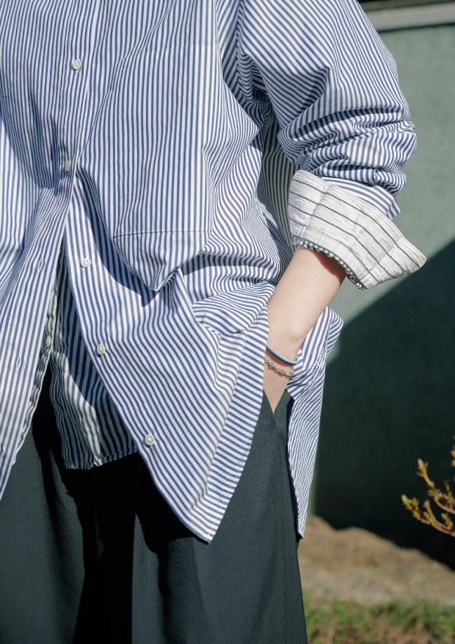 サイズ感ですね。今日みたいにシャツのレイヤードをする前提なので、中に着るジャストサイズのものと、上に重ねるオーバーサイズのもの、どちらも必要になります。外側に着たシャツは身幅は大きいのに肩はジャストなデザインで、ダルッとしすぎずきちんと感があっていいですね。あと同系色のものを重ねることが多いので、シャツの色味やストライプのピッチ幅なども重視しています。