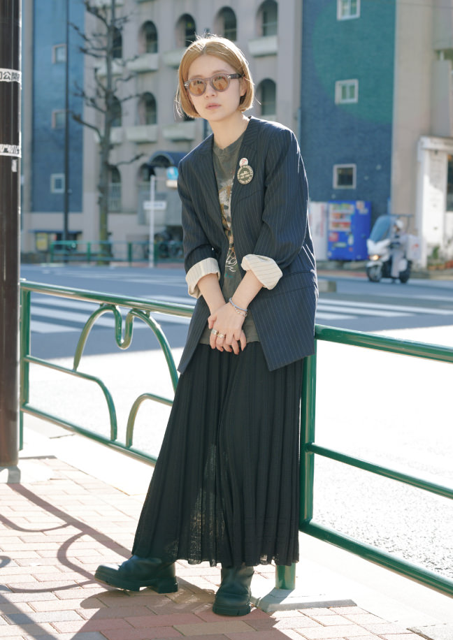 ボーイッシュなアイテムの割合を多めにします。今日もあえてクタクタのTシャツを合わせたり、ジャケットには缶バッジをつけたりして、遊びのあるスタイルにしました。あと足元はロングブーツを選ぶことが多いですね。ロングスカートから、筒っぽいストンとしたブーツが覗くのが好きなんです。スニーカーとかだと外しすぎな気がして、私にはこのバランスがちょうどいいですね。
