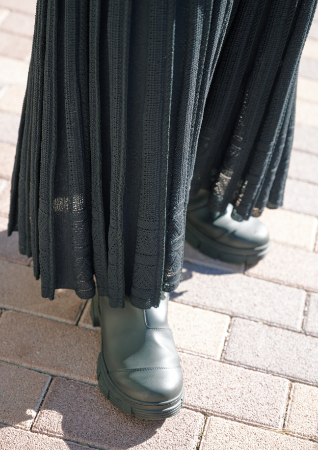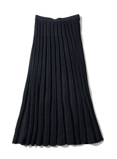 これはプリーツが細かくてトップスを選ばないところが優秀。あとは素材が軽すぎず、重さで自然と下に落ちてくれるので少女っぽくなりすぎないんです。ニットなので、柄が透けるところもお気に入りです。